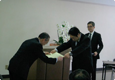 Company president Mr. Kaneko receiving the shield from senior manager Mr. Terui